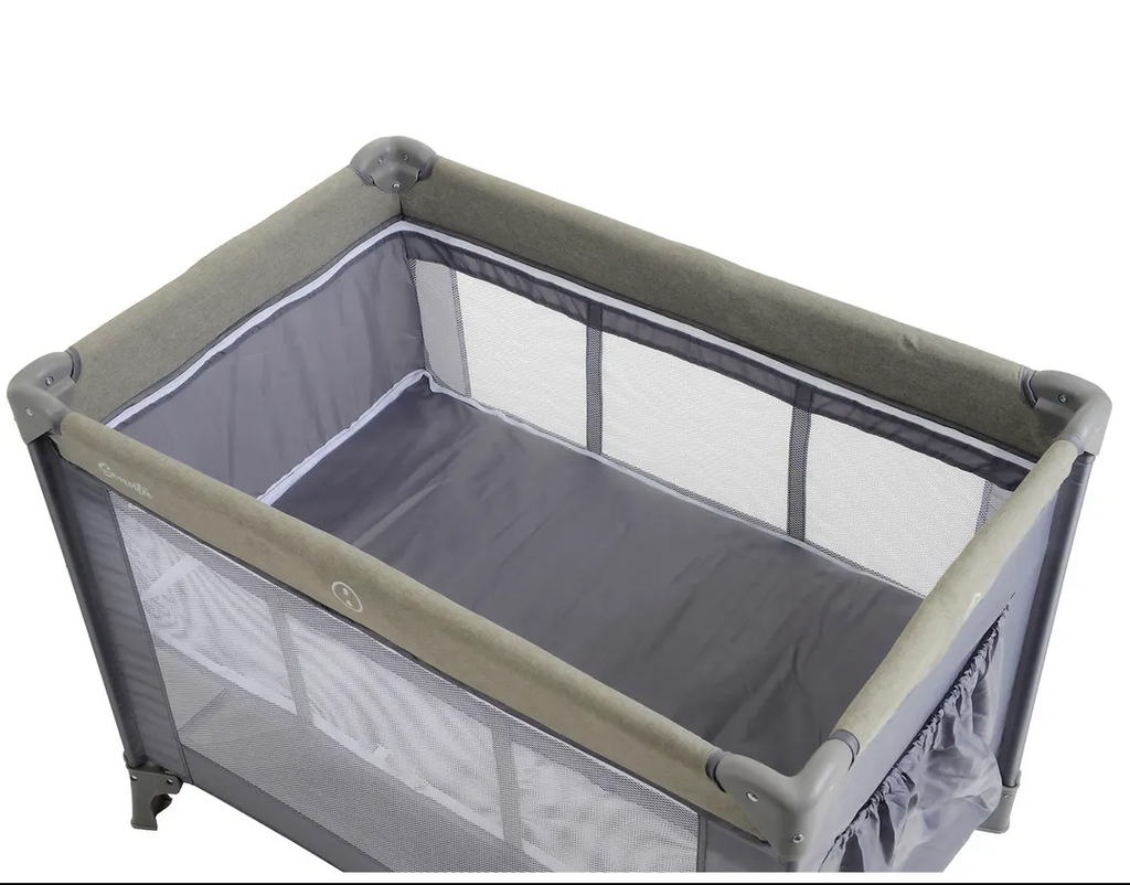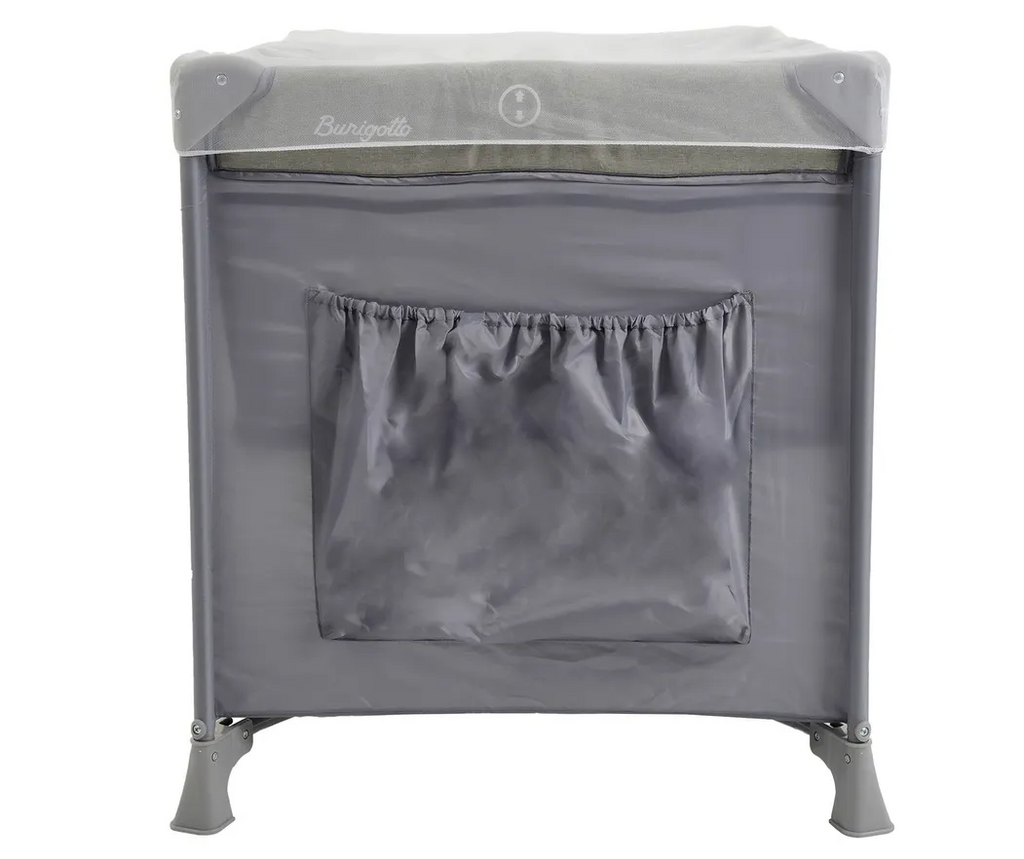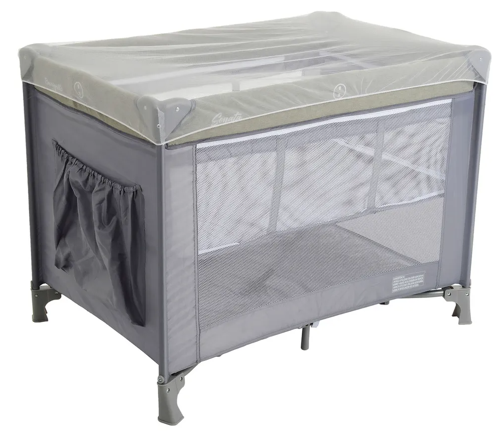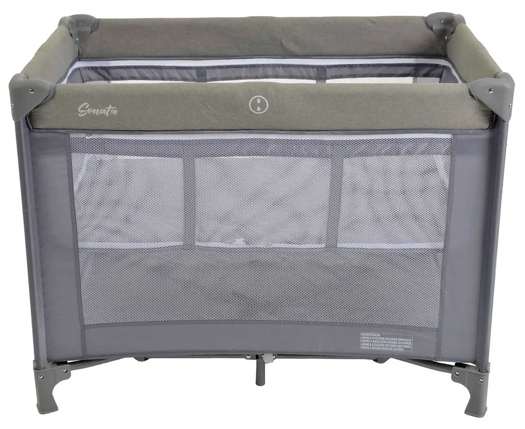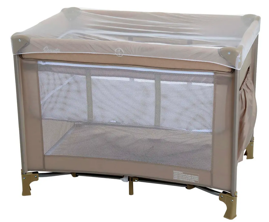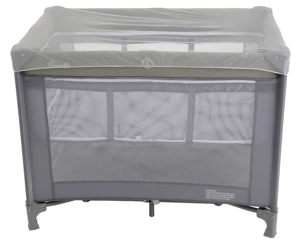 Mosquiteiro. • Travas de segurança nos quatro lados e no fundo do berço. • Bolso porta objetos. • Sistema de regulagem da base acolchoada com zíper. • Acompanha bolsa para guardar e transportar. • Lateral em tela para ventilação. • Compacto quando fechado. • Estrutura tubular em aço. • Peças plásticas em polipropileno e nylon